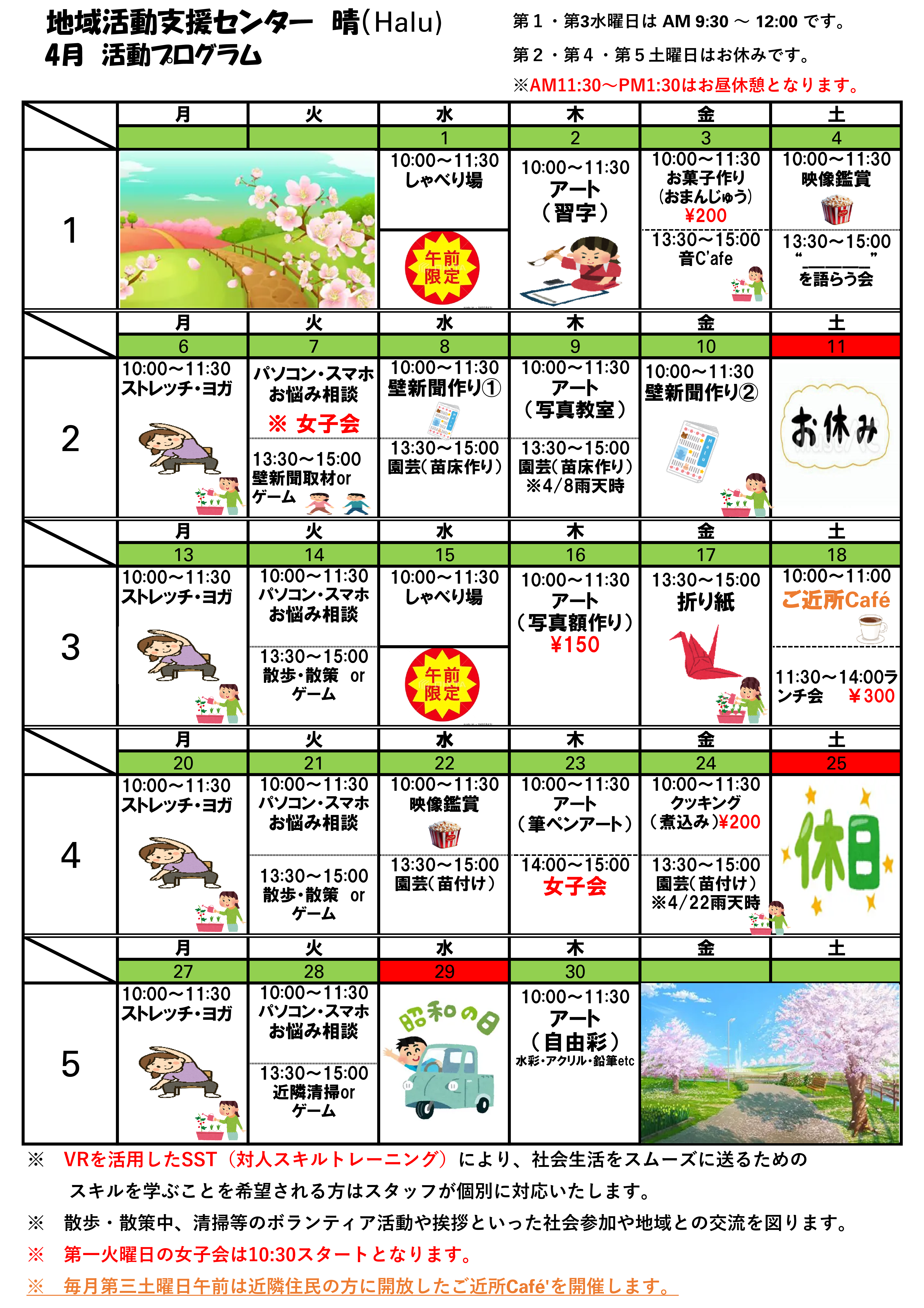 4月活動プログラム(プログラムの内容は随時更新予定です。)